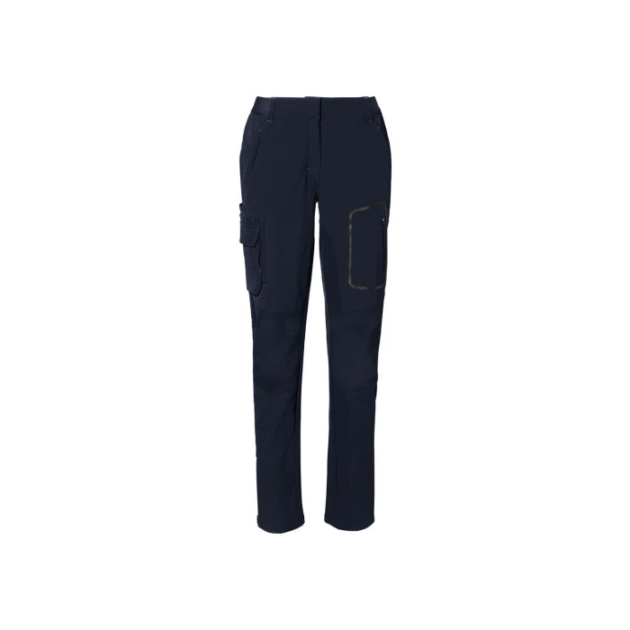 Sportlich leger geschnittene Arbeits- und Freizeithose für Damen, mit verdeckt eingearbeitetem Druckknopf, dehnbarem Hosenbund mit Kordel zur individuellen Weitenregulierung, Reißverschluss und Gürtelschlaufen. Zwei Einschubtaschen und zwei Gesäßtaschen mit verdecktem