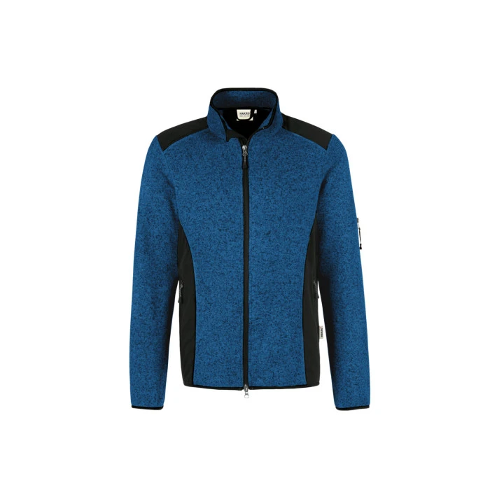 Nackenband, elastisches Saum- und Ärmelbündchen, kontrastfarbige Einsätze aus leichtem Softshell an den Seiten und Schultern. Zwei praktische seitliche Reißverschluss-Einschubtaschen und eine Reißverschluss-Ärmeltasche aus Softshell am linken Arm. Alle Reißverschlüsse von YKK®. Die Strickfleece-Jacke ist zusätzlich mit Teilungsnähten am Vorderund Rückenteil – für eine perfekte Passform – und einem Aufhängeband im Nacken ausgestattet. Gewebtes HAKRO ®-Necklabel aus hochwertigem Kettsatin mit ultraschallgeschnittenen Bandkanten für angenehmen Tragekomfort und gummiertes HAKRO®-Flaglabel in der linken Seitennaht.